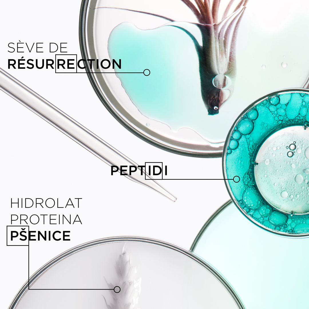 Sa dvostrukim dejstvom, kreiran za veoma oštećenu kosu. Njegova formula obnavlja vlas kose i štiti je od toplote do 230°C. Trenutno obnavlja kosu i zaglađuje površinu vlasi. Smanjuje ispucale krajeve i pomaže u bržem stilizovanju kose.